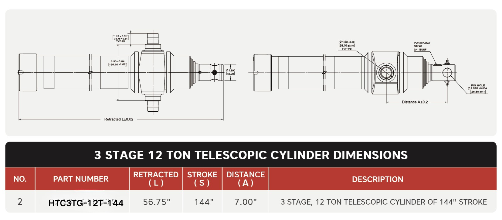"HTC3TG-12T-144"، 3 مراحل، 12 طن من 144 بوصة أسطوانات تلسكوبية